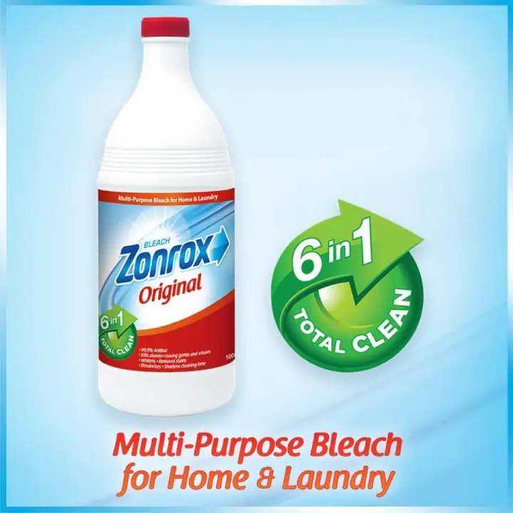 Zonrox Bleach is a 6 in 1 Total Clean Multi Purpose Bleach that can be used for laundry deodorizing and disinfecting at home offices and hospitals. Contact us on Twitter. 500 mL 250 mL 100 mL -999 antibacterial protection -Whitens laundry -Deodorizes by eliminating germs -Eliminates and reduce the spread of disease causing germs by killing 999 of common viruses bacteria and fungi Ecoli and Salmonella -Removes tough and stubborn stains -Shortens cleaning time - Buy ZONROX ORIGINAL BLEACH.